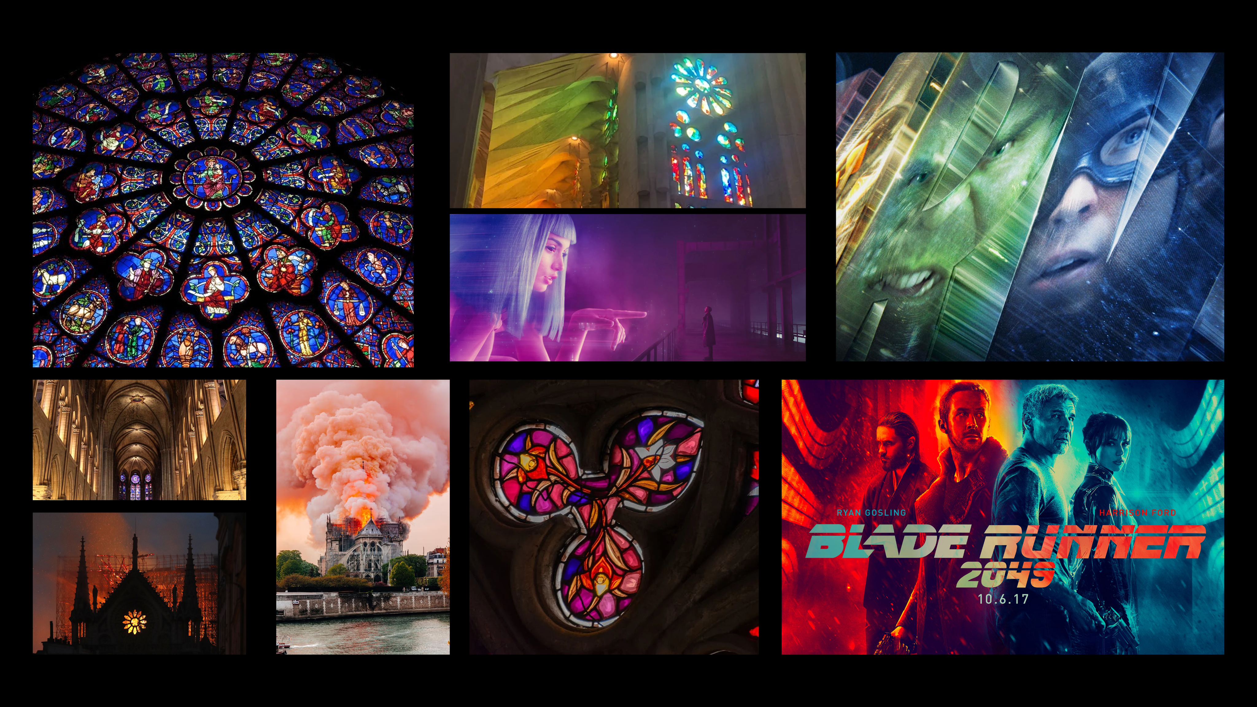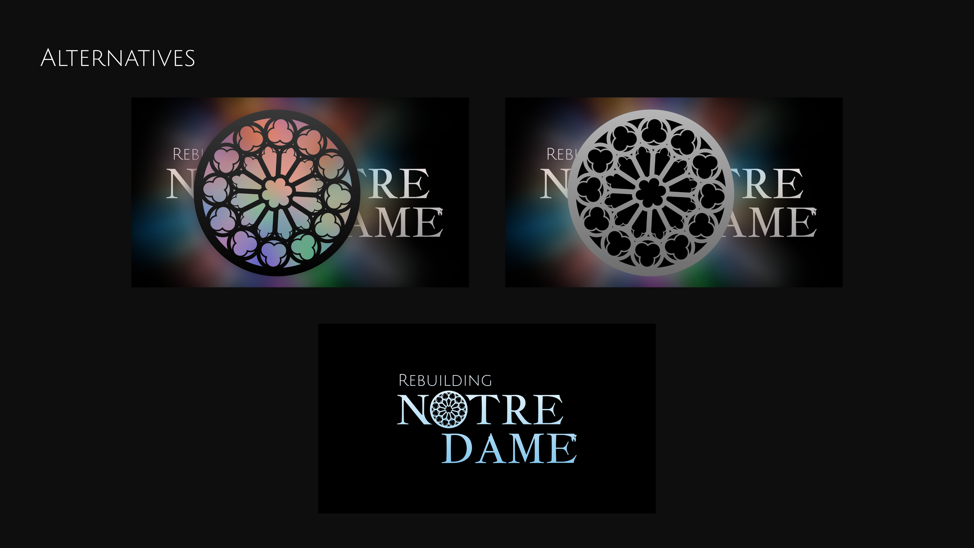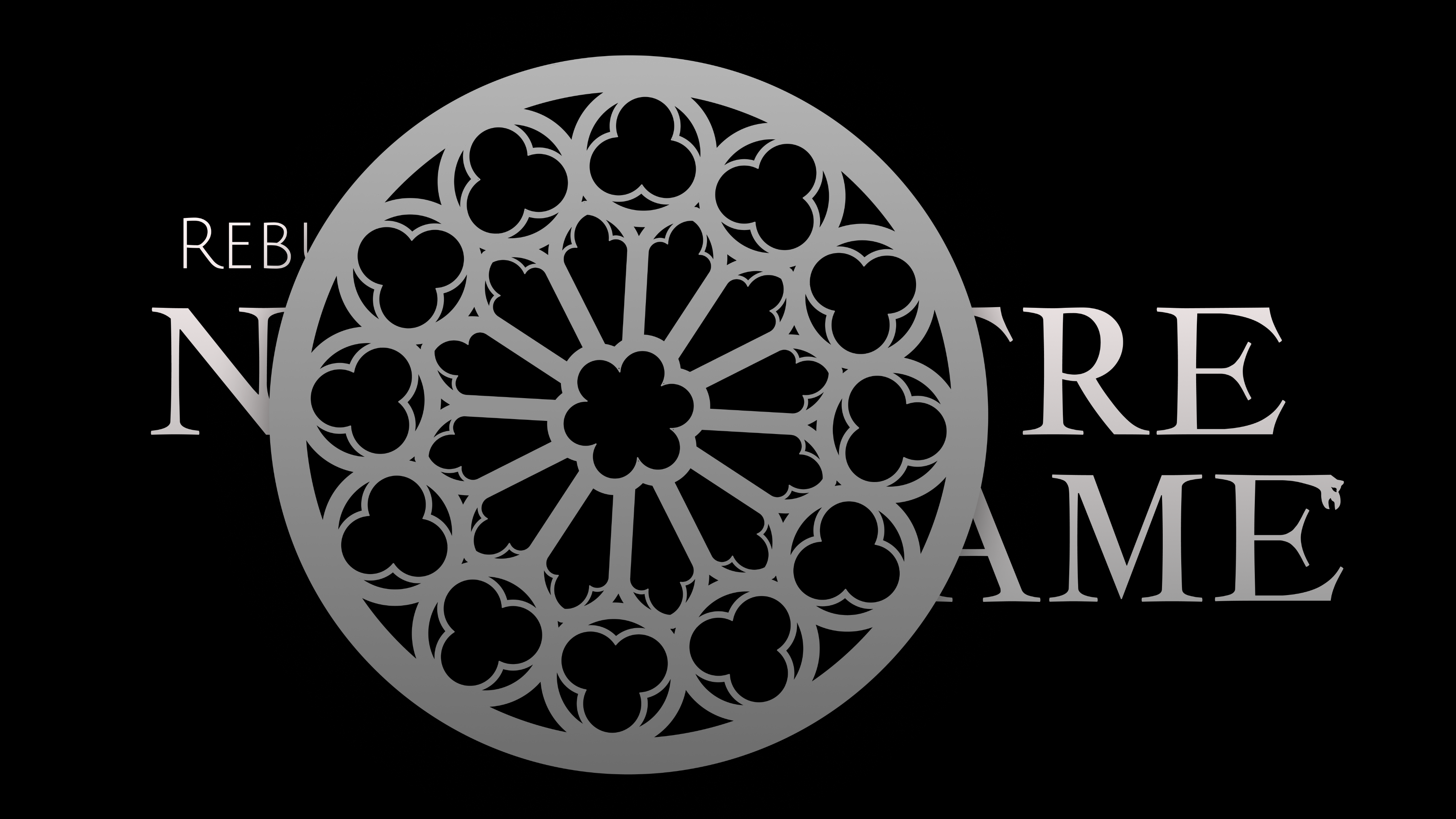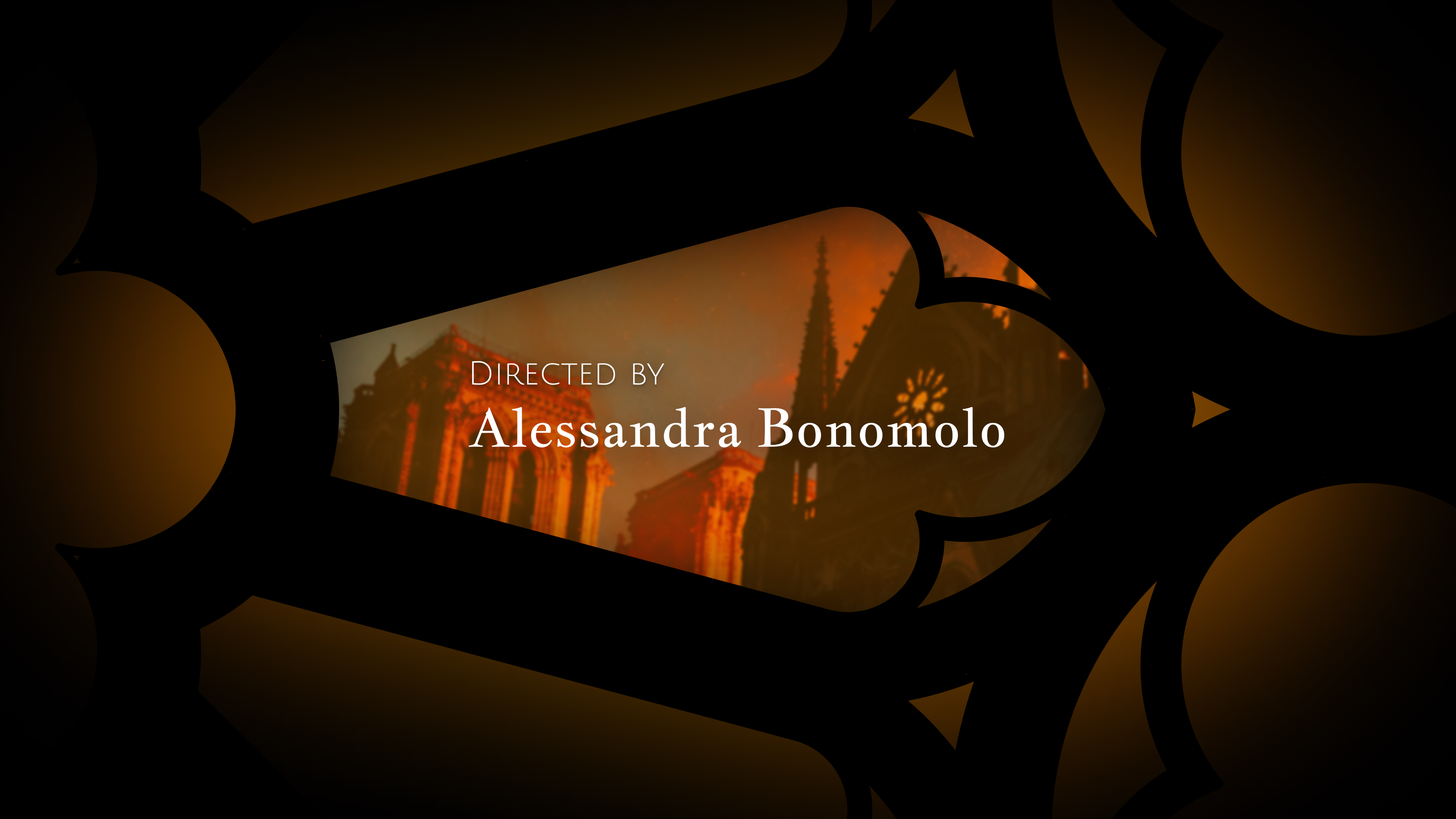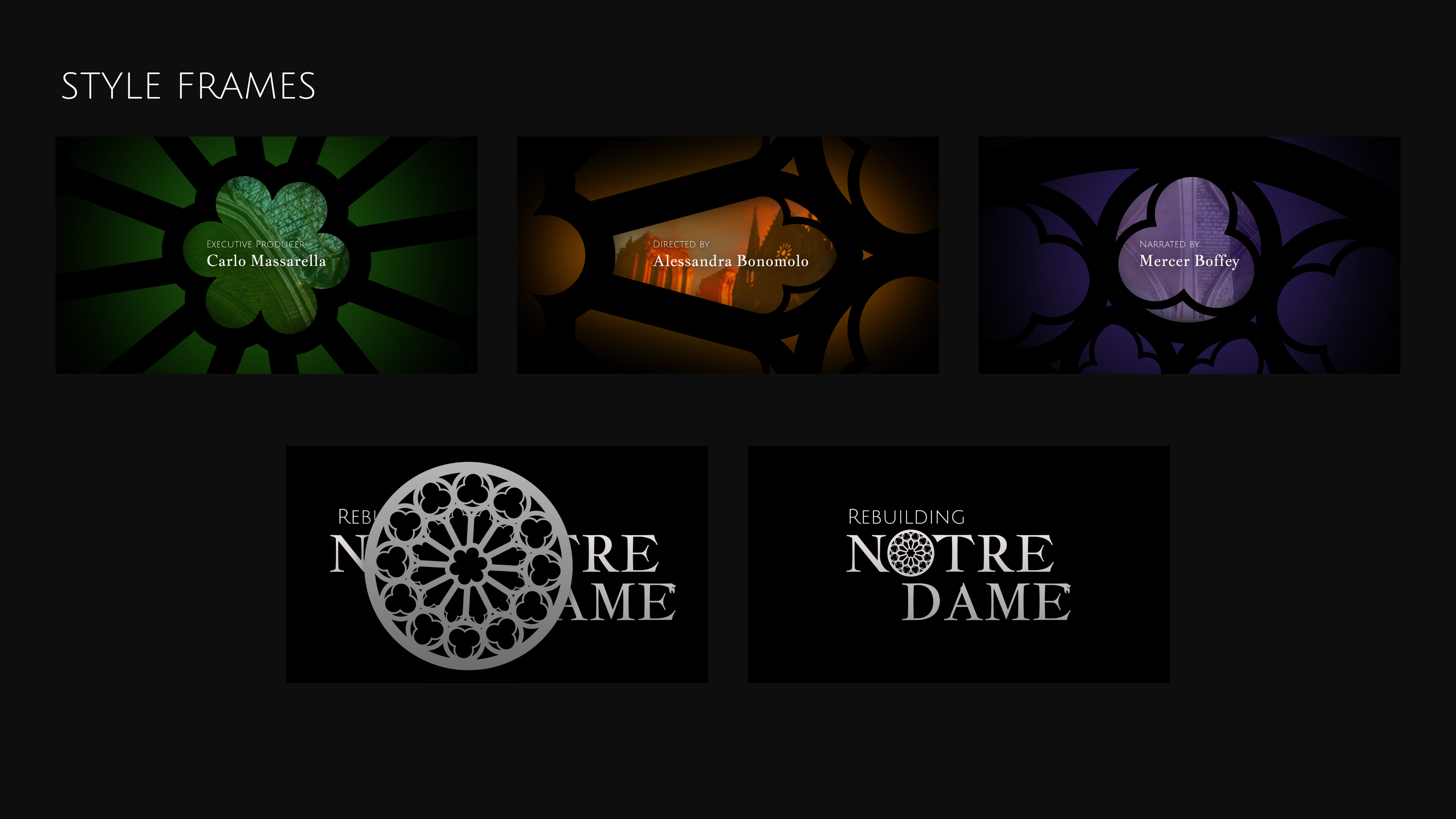 The sequence will consist of shots from the documentary being shown through and in between the stained glass windows & their intricate tracery, individual scenes will glow with a different color and will be shown from inside a window segment. It will zoom out to reveal the entire rose window, the images will subside and the window will become the “o” of Notre Dame.